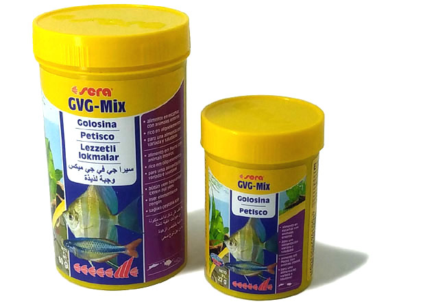 Alimento en copos rico en yodo con sabrosas golosinas. SERA GVG-mix consiste en un 80% de copos especiales hechos de algas marinas. krill molido y plancton. El 20% se compone de larvas rojas de mosquito, dafnias, y artemias liofilizadas. Este alimento rico en yodo, evita las enfermedades de la glándula tiroides y debería administrarse a los peces por lo menos una vez por semana. SERA GVG-mix, es especialmente adecuado para acuarios comunitarios con un número elevado de carpas dentadas vivíparas, así como para peces de agua salada.