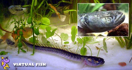 Este exótico pez habita en el fondo del acuario comiendo restos de comida. Mide 15 a 18 cm con un grosor de unos 2 cm. Su forma es como una anguila, pero con una cabeza grande y con aspecto feroz., sin embargo es una especie totalmente pacífica que convive con todo tipo de peces.